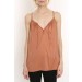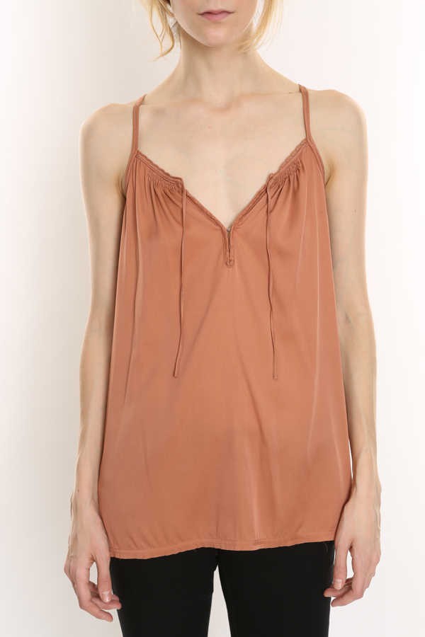 Silk cami. Tie front detail, with hook and eye. Ruched neckline. Loose through the chest and bodice. 100% Silk. Dry clean.